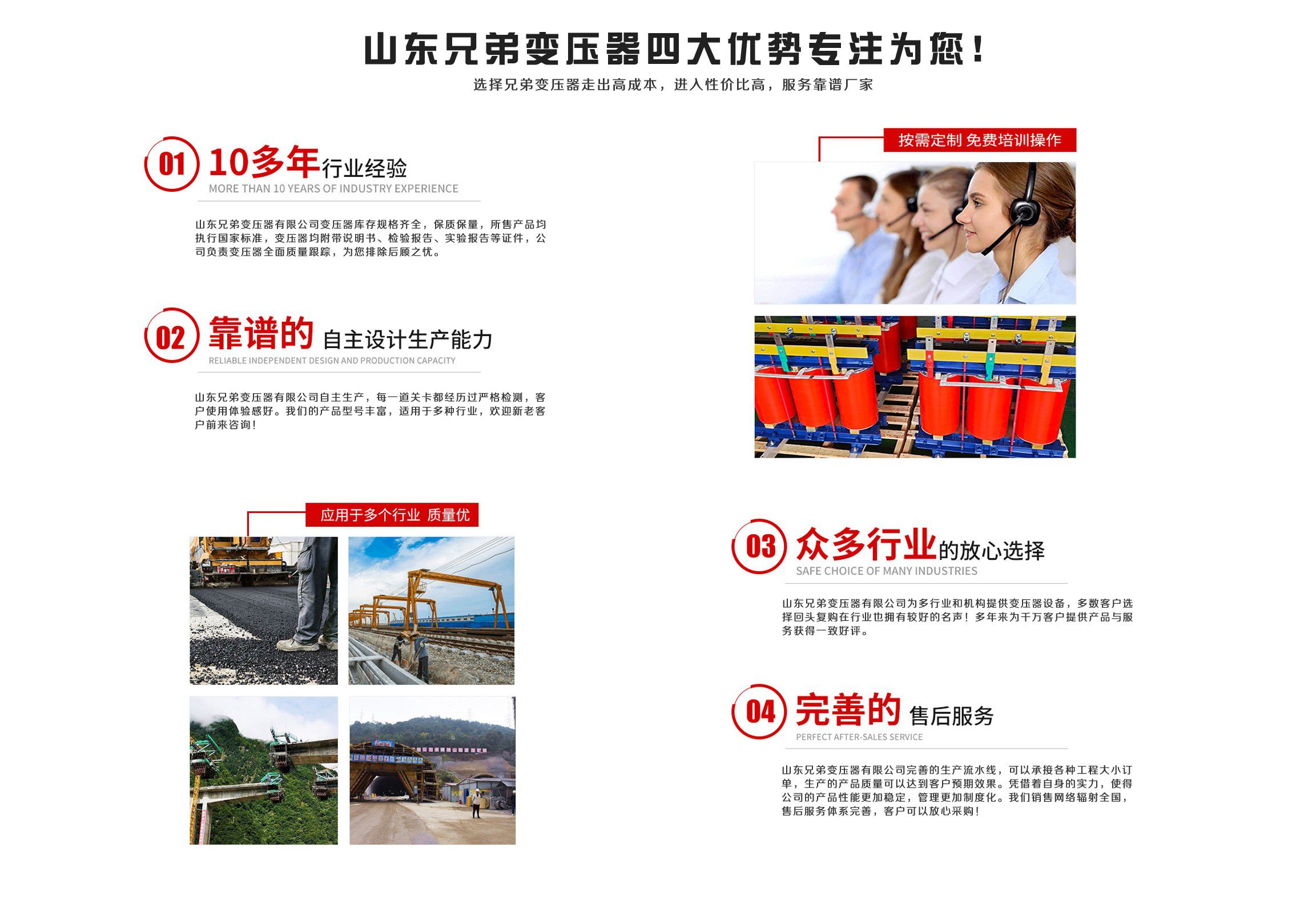山東兄弟變壓器有限公司經營SCB10干式變壓器,SCB11干式變壓器價格,SCB12變壓器,SCB13干式變壓器,SCB14干式變壓器,SCB18干式變壓器等產品及用戶要求的特殊變壓器?! 」镜馁|量方針是:“顧客的滿意,是我公司的追求。”堅持質量,用戶至上,以質興業,以優取勝,愿為廣大用戶設計各種要求的變壓器,以求共同發展。 企業精神:“創新、求實、誠信、高效”。 企業作風:“嚴、細、實、快”?! ∑髽I工作方針:“加強內部管理,夯實基礎,全面提高職工整體素質,使企業管理水平再上新的臺階”。 公...